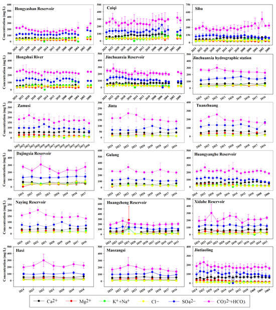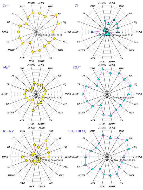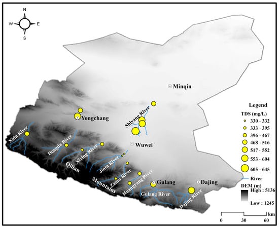 - Zhang, Z.; Jia, W.; Zhu, G.; Shi, Y.; Zhang, F. Hydrochemical characteristics and ion sources of river water in the upstream of the Shiyang river, China. Environ. Earth Sci. 2021, 80, 614. [Google Scholar] [CrossRef]