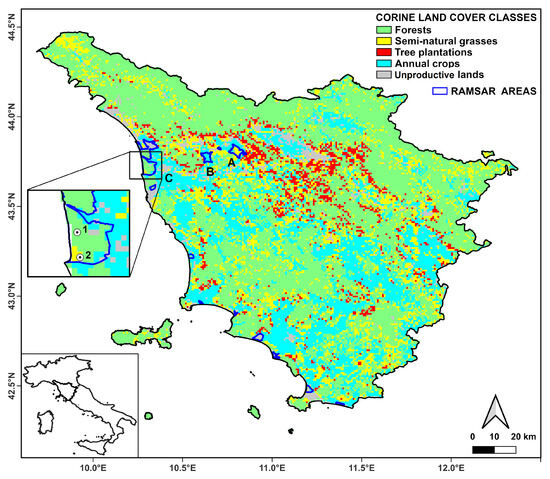 CORINE land cover categories of Tuscany defined as in [], with superimposed Ramsar areas; the three areas chosen for model calibration are Fucecchio (A), Migliarino (B), and San Rossore (C). The lower left box shows the position of Tuscany in Italy, while the upper box indicates the location of the two test sites in the San Rossore area (1 = forest, 2 = grassland).