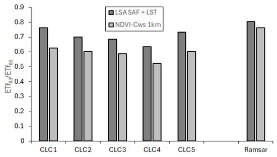 Mean ratios ETf08/ETf06 of the five CLC categories and Ramsar areas obtained from the LSA SAF + LST products and NDVI-Cws estimates (see text for details).