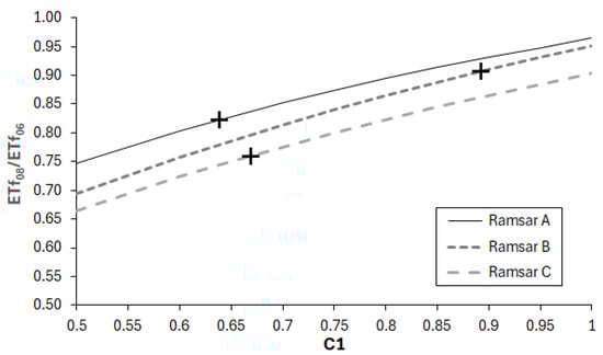 ETf08/ETf06 ratios simulated for varying C1 values in the three selected Ramsar areas with indication of the optimum ratios and corresponding C1s identified from the integrated LSA SAF + MODIS ETf product (crosses).