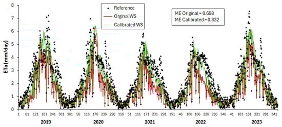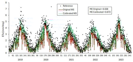 Similar results are obtained for the San Rossore grassland site; Figure 8 shows the reference ETa evolution computed by the site water balance, together with the estimates obtained by the original and the calibrated NDVI-Cws model versions. Also, in this case, the reference mean annual ETa is slightly above 800 mm and 2022 corresponds to the driest year. The general ETa pattern is better reproduced by the calibrated NDVI-Cws method, which corrects the underestimation observed when the original WS coefficients are utilized. The improvement is testified to by the Nash-Sutcliff ME, which increases from 0.698 to 0.832.