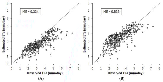Remote sensing techniques have been widely applied for ETa prediction due to their capacity to monitor land surface features with high spatial and temporal resolutions [,]. These techniques are usually categorized into energy balance, water balance, and mixed methods []. Energy balance ETa estimation methods offer the advantage of directly assessing the water fluxes coming from the examined land surface and have, therefore, been widely investigated and applied []. These methods, however, are affected by two main issues. First, the actual temporal frequency of good-quality thermal infrared (TI) imagery may be significantly reduced by atmospheric disturbances, which are obviously more frequent in humid areas and periods []. Second, the spatial resolution of the available TI imagery is generally low, and this issue can be only attenuated by the application of spatial sharpening procedures which introduces additional uncertainty [].