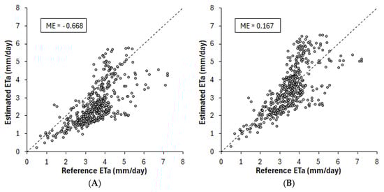 As in the previous case, a further analysis is focused on the summer dry period. Figure 9A shows the scatter plot of the ETa estimates obtained from the original model versus the respective references; Figure 9B shows the same scatter plot for the calibrated ETa estimates. Both graphs are characterized by a high dispersion around the 1:1 line, especially for high ETa values. The original model version, however, strongly underestimates the reference ETa, yielding a negative Nash-Sutcliff ME (−0.668); this problem is mostly corrected by the model calibration, which produces moderately good ETa estimates and a positive ME (0.167).