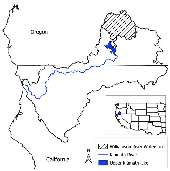 - Cummings, M.L. Hydrogeology of the Williamson River Basin, Upper Klamath Basin, Klamath County, Oregon. Master’s Thesis, Portland State University, Portland, OR, USA, 2007; p. 70. [Google Scholar]