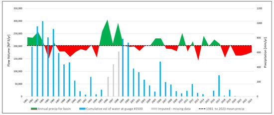 Cumulative flow at gage #3500 vs. cumulative precipitation by year, 1981–2023. Green values indicate above-average annual cumulative precipitation, and red values indicate below-average. Flow data for the years 1996–1998 are absent from the record due to deactivation of the gage; therefore, we show linearly imputed values as gray bars.