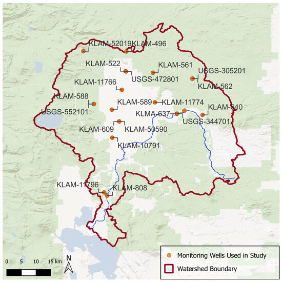 All datasets used in the creation of this research paper are freely available on the internet through Federal and State environmental and research agencies. Federally run monitoring well logs can be found through the US Geological Survey groundwater mapper website (https://waterdata.usgs.gov/nwis/gw (accessed on 14 November 2024)) and by entering the associated well number. Other monitoring wells’ data can be accessed at Oregon’s Water Resource Department (https://www.oregon.gov/owrd/pages/index.aspx (accessed on 14 November 2024)) by locating the well by county (Klamath) and the well ID number. All flow data are available through the US Geological Survey (https://waterdata.usgs.gov/nwis/sw (accessed on 14 November 2024)) by entering the identification number of the gage used.