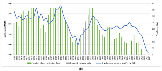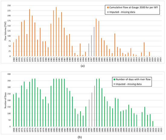 (a) Total annual flow volume and (b) number of days with measurable flow at gage #3500 per year from 1968 to 2023. Missing data were imputed using linear interpolation and are shown in gray.