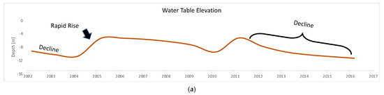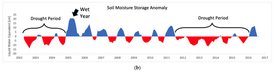 Correlation between groundwater levels and GLDAS soil moisture for a monitoring well near Beryl, UT, USA. (a) Water table elevation from 2002 to 2017. (b) GLDAS soil moisture anomaly for the same period (blue = positive anomaly, red = negative anomaly). Adapted from Evans et al. [50].