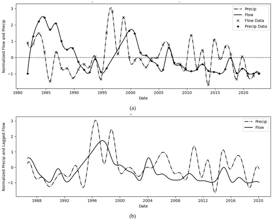 (a) Cumulative annual precipitation and flow data normalized and interpolated to monthly values using standard score or z-score normalization to plot both datasets on the same scale. Data were normalized to the study period, not the long-term average and variance. (b) Cumulative annual precipitation compared to cumulative annual flow with a lag of 32 months. The period from 1996 to 1998 has no annual flow data; data in this period were interpolated.