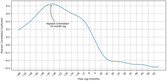 To better characterize the correlation between cumulative annual precipitation, we computed the Pearson correlation coefficient using monthly lags from −60 to +60 lags (±5 years) between the two series. We found that the highest correlation occurs at a lag of −32 months, with r = 0.525, p < 0.001 (Figure 8). The computed p-value is essentially zero but is based on the interpolated monthly values, so it is not representative of the data. Our analysis showed that there is not a sharp peak in the correlation values, but a relatively smooth transition. This indicates that the lag that produces the highest correlation probably changed over the 43-year study period. We would expect a longer lag at low groundwater levels and a shorter lag at high groundwater levels. Figure 7b shows cumulative annual precipitation data plotted with cumulative annual flow data lagged by 32 months. In general, these two datasets are visually correlated. The no-data period, from 1996 to 1998, is not as visually correlated, as the interpolated data do not follow precipitation.