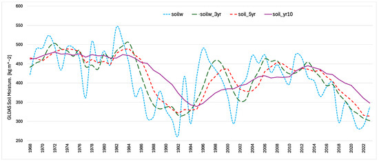 To better understand the correlation between groundwater and streamflow, we derived the groundwater storage change using the GWDM tools. The monthly GLDAS soil moisture (soilw) dataset for the GLDAS grid cell containing the centroid of the Williamson Basin and the 3, 5, and 10 yr moving averages of the soil moisture are shown in Figure 9.
