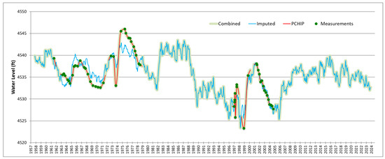 An example of actual water level measurements, short-term PCHIP-interpolated values, and ELM-imputed values to create a combined dataset for the KLAM0000496 well in the Williamson Basin. Each well in the dataset was put through the same analysis to create PCHIP-interpolated values and ELM imputed values to generate a full time series. Well KLAM0000496 is the Klamath volcanic aquifer and showcases high fluctuations in water levels. Fluctuations up to 3.6 m (12 ft) are common in wells near the Cascade Range [9].