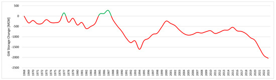 Net groundwater storage change for the Williamson Basin from 1968 to 2023 with 1968 as the datum; green indicates values above the datum and red below. We hypothesize that groundwater pumping is the reason for the consistently lower volume of water in the aquifer when compared to the 1970s/80s. Pumping prevents the aquifer from fully recharging. Groundwater pumping began in the 2000s in response to the previous dry years along with mandates to reduce surface water usage [6,66]. However, the volume of water removed cannot be quantified at this time.