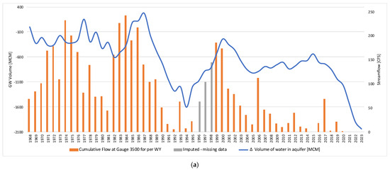 Figure 12a compares the groundwater storage curve to the cumulative streamflow data at gage 3500. Visually, there is a strong correlation between the decline in groundwater storage and declining streamflow from 1985 to 1995, followed by a rebound in both 1985 and 2000. After the rebound, both streamflow and storage declined through 2005, which was followed by a steeper decline in groundwater storage starting in 2015. This decline in groundwater storage is followed by a complete cessation of streamflow in 2021. The Pearson correlation coefficient between the groundwater storage and streamflow is r(n = 54) = 0.64, p < 0.01, relatively well correlated.