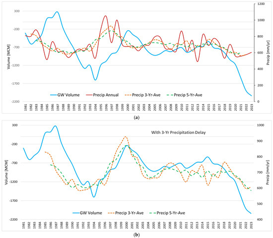 Groundwater storage change in the Williamson Basin from 1981 to 2023 vs. (a) cumulative annual precipitation and 3 and 5 yr moving average annual precipitation and (b) 3 and 5 yr moving average annual precipitation with a 3 yr lagged groundwater storage change.