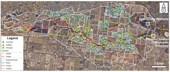 The model was run in 1D with the dynamic wave option for drainage network hydraulics and calculation and reporting timesteps of 30 s, and 1 h, respectively. Runtime took 3.5 h for a simulation period of 2 years and 6 months (May 2022 to October 2024). The Sparrovale contributing catchments were estimated to have a total area of 4037 hectares, with the Horseshoe Bend catchment considerably smaller (943 hectares) than the Armstrong Creek catchment (3094 hectares). The Sparrovale catchment is primarily occupied by open space and agricultural land (as shown in Figure 3), although there has been a noticeable increase in residential and commercial development in the past 10 years, (as evident in aerial photographs), with further development expected. Based on aerial photography, approximately 20% of the total catchment area was classified as urbanized in August 2022 [56]. The remaining large open space/agriculture area implies that infiltration loss should be a key driver for the overall catchment water budget.