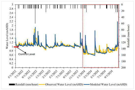 Modeled and observed water level at Horseshoe Bend Linear Wetland outlet, with pump operation (14 December 2023 to 23 April 2024) and low-flow gate operation (24 April 2024 to 29 October 2024) periods enclosed in red box, NSE = 0.79; R2 = 0.89.
