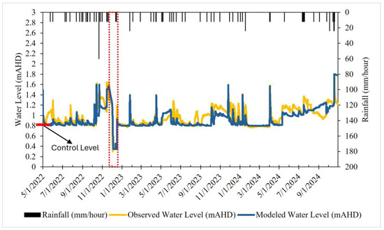 Modeled and observed water level at Balog Channel outlet, with pump operation period (20 November 2022 to 17 December 2022) enclosed in red box, NSE = 0.55; R2 = 0.8.