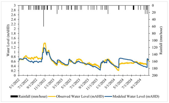 Model predictions for water levels in Balog Channel are satisfactory (Figure 4, NSE = 0.55 and R2 = 0.8) (Figure 5). The observed water level at Balog exhibits greater fluctuations than at Horseshoe Bend, reflecting its more complex hydraulics with more active control gate deviations to manage the larger runoff volume from the Armstrong Creek catchment. While our model generally corresponds well to the rainfall data, the observed data show occasional divergence from the rainfall pattern, particularly during some of the no-flow and low-flow events (May 2022 and mid-August to late-September 2023). This discrepancy appears to be related to the uncertainty of using a single rain gauge in representing the spatial coverage of rainfall [61,63]. Rainfall data from the Ocean Grove station located at 38°15′0.23″ S, 144°30′35.64″ E (ID: 87178), with a similar distance but southwest from Sparrovale Wetland, were used to run the model for comparison. The Ocean Grove gauge tends to record much higher rainfall than the Geelong Racecourse gauge due to its proximity to the coast, leading to an overestimation of catchment runoff and water levels, particularly in the Balog Channel. For example, during wet month periods of June to August 2022 and November to December 2022, the Racecourse data produced a better fitting model.