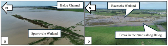 Drone footage taken on 16 October 2022 of (a) Sparrovale Wetland and (b) Balog Channel, including the overtopping to the adjacent open space (foreground).