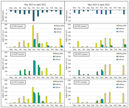 Figure 8 summarizes the monthly flows entering Balog Channel, Fishway, and Culvert for the NR, SOP, and SUI scenarios in wet (May 2022 to April 2023) and dry years (May 2023 to April 2024). The monthly rainfall distribution for both years follows a distinct seasonal pattern, with the wet year exhibiting greater rainfall variability compared to the dry year. Specifically, the wet year is characterized by a wetter winter (June to August) and spring (September to November), a drier summer (December to February), and a comparable rainfall pattern in autumn (March to May). The monthly total inflow to Balog Channel under the NR scenario (Figure 8a,b) is higher than the combined Fishway and Culvert flows to Baenschs Wetland, with peak flows occurring in October (580 × 103 m3) and November (370 × 103 m3) during the wet year, and in December (240 × 103 m3) and January (230 × 103 m3) during the dry year. The Balog inlet would receive inflow year-round under the NR scenario, while the Fishway and Culvert outlets activate only in high-rainfall months. Excessive inflow to Balog during high rainfall events may surpass the storage capacity, causing the risk of overtopping Balog Channel (Section 3.2). High water levels would be expected year-round in Sparrovale Wetland. Similarly, the dependence of the Fishway and Culvert operation during high rainfall events may cause seasonal disparity and prolonged drying periods in Baenschs Wetland.