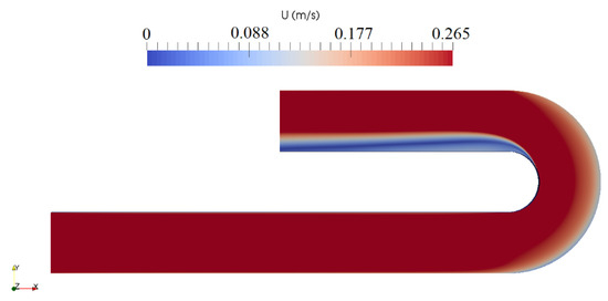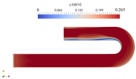 Figure 6 presents the velocity magnitude pattern at the top of the curved, closed channel, while Figure 7 shows the velocity magnitude distribution at the surface in the curved, open channel after the flow reaches a steady state. As expected, in both cases, the flow behavior is influenced by curvature-induced secondary currents, leading to noticeable velocity redistribution along the bend. The k-ω SST model can reasonably simulate the expected flow features as explained in the following. At the entrance of the bend, the maximum velocity initially shifts toward the inner bank due to the development of centrifugal forces and pressure gradients. In the closed-channel scenario (Figure 6), the rigid-lid assumption constrains surface movement, leading to different flow structures compared to the free-surface case. These differences are particularly evident in the velocity magnitudes. In the open-channel case (Figure 7), free surface deformation plays a significant role in modifying the velocity pattern, as surface gradients contribute to the redistribution of momentum.