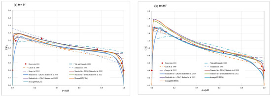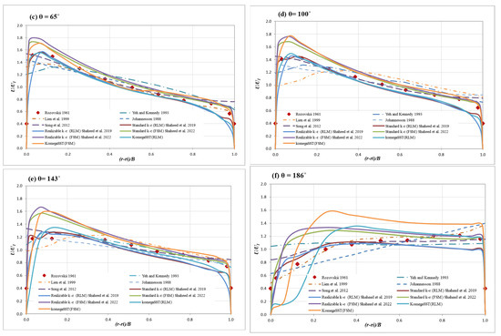 A comparison of resultant velocities across the dimensionless channel width for the Rozovskii channel: (a) at θ = 0°; (b) at θ = 35°; (c) at θ = 65°; (d) at θ = 100°; (e) at θ = 143°; and (f) at θ = 186°.