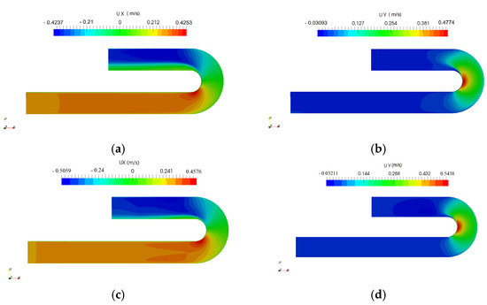 Variations in velocity distribution for curved channels. (a) Ux velocity distribution at RLM. (b) Uy velocity distribution at RLM. (c) Ux velocity distribution at FSM. (d) Uy velocity distribution at FSM.