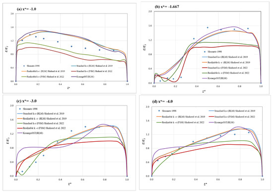 Resultant velocities across dimensionless transverse distance for confluent channel (a) at x* = −1.0; (b) at x* = −1.667; (c) at x* = −3.0; and (d) at x* = −4.0.