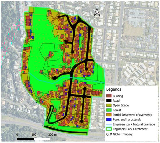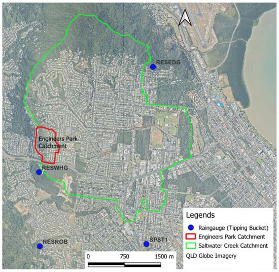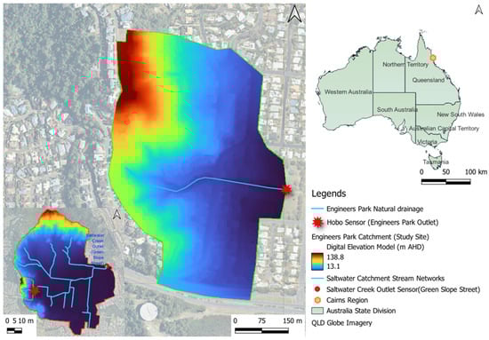 Engineers Park is a small sub-catchment of the Saltwater Creek catchment in Cairns City, Queensland, Australia (Latitude = −16.911, Longitude = 145.72), as shown in Figure 1. This catchment has a total area of 0.27 km2, a small fraction of the Saltwater Creek catchment, which spans a total area of 16 km2. The catchment is topographically characterised by a short width of approximately 600 m and a significant elevation difference, ranging from about 11 m Australian Height Datum (AHD) at the outlet to 139 m AHD at the upstream. The comprehensive flood modelling was undertaken at small spatial scale and focused on understanding rainfall driven localised flooding scenarios at this study site, before simulation work was expanded to whole catchment.