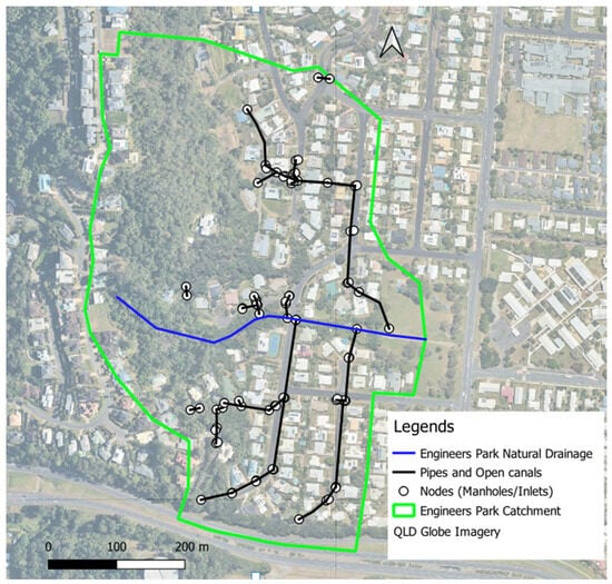 Currently, the Council manages stormwater runoff in the catchment using grey infrastructure, such as inlets, pipe networks, and manholes, to intercept runoff and direct it to the nearest partially paved channels that run through the catchment. The CRC also provided the drainage network data, shown in Figure 2. After receiving the grey infrastructure data, a desk study was followed by a discussion with CRC representatives through a field visit for onsite measurements.