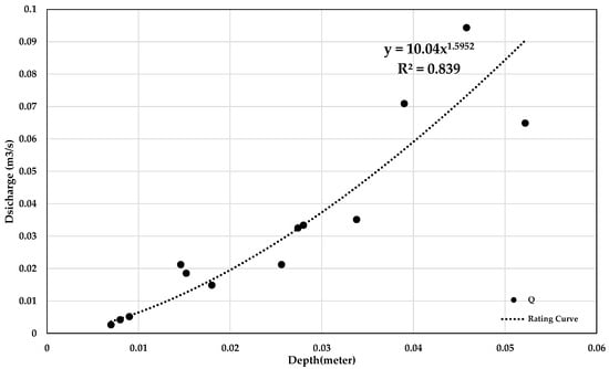 The velocity measurements were conducted at the sensor location five times during the 2023 wet period, and a rating curve was developed. The measured water level from the pressure transducer sensor was converted to discharge using the rating curve shown in Figure 6.