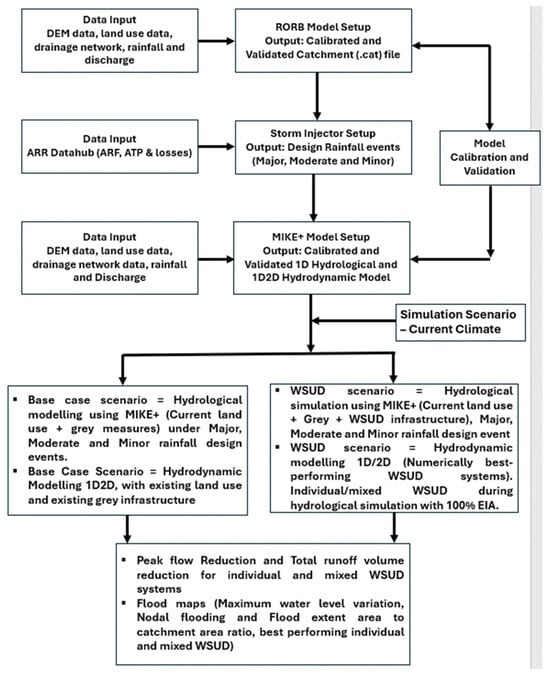 To improve decision-making and the implementation of robust WSUD systems, research is needed to assess WSUD performance in complex hydrological regimes and its interactions with other infrastructure to mitigate flooding explicitly in tropical regions. Therefore, this research adopted the approach of integrating WSUD measures into existing grey measures to evaluate the flood mitigation potential of the combined approach. We also assessed the strengths and weaknesses of both measures to highlight the need for an integrated approach to deal with the flooding challenges. Contributing to this knowledge gap, this study is designed for a wet tropical coastal sub-catchment to answer the following questions: (i) how effective are existing grey measures in mitigating flooding? (ii) how does integrating WSUD with existing grey infrastructure contribute to flood mitigation? and (iii) what are the factors that impact WSUD application in the tropics?