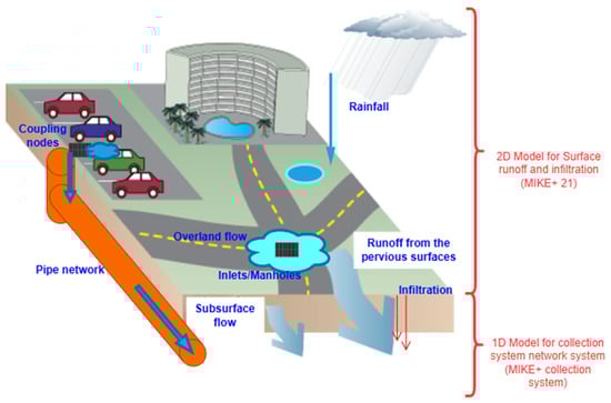 The MIKE+ 1D geometry and 2D geometry model setup is shown in Figure 9. The MIKE+ model catchment and collection system (CS) platform was used to define the pipe networks, inlets, manholes, and canals at this study site. Additionally, the 2D overland flow platform within the model was utilized to develop a rectangular grid with a spatial resolution of 1 × 1 m. The nodes (inlets, manholes) in MIKE+ 1D collection system were linked to 2D overland cells. The water can be exchanged depending on the level difference and weir/orifice equation []. The coupling platform within the tool connected the 1D2D model created in a separate MIKE+ platform. Finally, MIKE+ also has a platform to support the application of WSUD techniques and hydraulically connect these measures with existing drainage networks or each other.