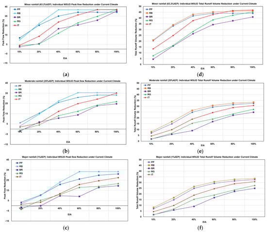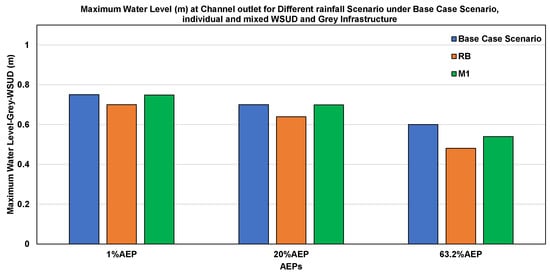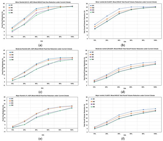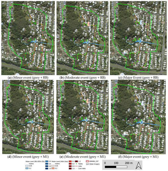 This study tested three rainfall scenarios as part of the baseline scenarios. The rainfall design events considered for scenario testing are major (1% AEP), moderate (20% AEP), and minor (63.2% AEP). In addition, hydrological simulations for all three rainfall design events were conducted with the WSUD system, with EIA reduction ranging from 10% to 100%, as shown in Table 5. Five different types of WSUD systems were selected for testing. Furthermore, earlier studies have reported that combining different WSUDs helps improve peak flow reduction [,,]. The WSUD systems combine to leverage the functions of both retention and infiltration-based systems, thereby improving overall efficiency. Infiltration measures primarily function to reduce the runoff volume, groundwater recharge and restore baseflow []. Some of the approaches under this category are permeable pavement, swales, bio-retentions, and infiltration trenches []. On the other hand, retention based approaches retain water, for short or time and released slowly to reduce peak flow and volumes []. This technique uses measures such as wetlands, ponds, rain barrel and retarding basins []. Thus, the individual WSUD systems were later combined from M1 to M4, as shown in Table 5, to evaluate the efficiency of mixed systems. Finally, 1D2D hydrodynamic modelling was conducted for the best-performing individual and mixed systems, assuming a 100% EIA reduction, to assess flooding hotspots, inundation, and maximum water level (MWL) alterations.