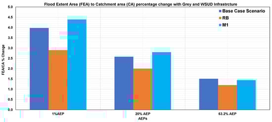 The current land use and grey measures are a base case scenario simulation. The hydrological effectiveness of WSUD applications as a point source control measure in urban catchments was assessed, considering the reduction of effective impervious area (EIA). The decrease in permeability in urban areas substantially reduces natural flora, and the interception, retention, and infiltration of stormwater runoff are also reduced. This positively impacts runoff rates and volumes, thereby decreasing interception and infiltration. The effective EIA is the portion of the urban area that directly contributes runoff to the drainage network, increasing peak flow and runoff volume []. Literature has suggested that the reduction in EIA can lower the probable impact of climate change and urbanization on hydrology and the efficiency of grey measures [,,,].