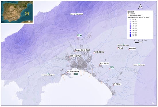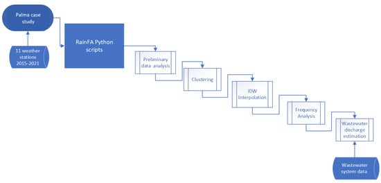 This paper presents a new software package coded in Python for Rainfall Frequency Analysis (RainFA) [15] and applies its procedures to the case study of the city of Palma (Spain), where the insufficient capacity of its sewerage system determines the number of discharges into the Mediterranean Sea, affecting the water quality and increasing the possibility of beach closures, which ultimately affects the tourism sector [16,17]. Starting with subdaily rainfall data from 11 stations for the period 2015–2021, RainFA is used to homogenize to daily and curate the registers and, after a statistical analysis and clustering process, to determine a homogeneous group of 7 stations that can be considered to be a region. Next, a PDF is fitted for both the daily rainfall and the number of rainy days per year. The resulting runoff generates pollution vectors that have a significant impact on fresh and estuary waters; consequently, efforts to minimize their impact are required, in accordance with European regulations [18,19] and their respective state transpositions [20]. In response to these challenges, RainFA implements a methodology to quantify the annual discharges into the Mediterranean Sea, which will improve the capabilities of the future digital twin of the sewerage system that EMAYA is currently developing in the area [16].