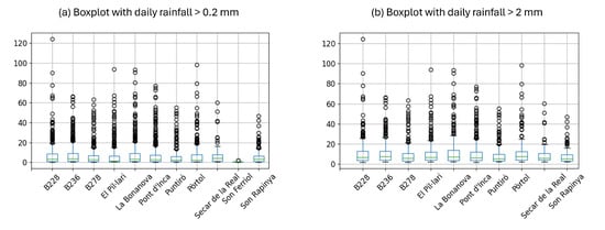 Rainfall time series are cataloged as functional data to provide measurements in a temporal continuum that can be plotted on curves or surfaces for their analysis [25]. According to [26], a side benefit of some of the functional data analysis techniques is the identification of outliers that may not be obvious from a standard statistical analysis or a graphical representation of the original data. An early approach to this representation was John Tukey’s box and whiskers plot (or boxplot) that represents, in a compact form, the distribution summary statistics [27]. RainFA introduces boxplots of each data series to identify the potential outliers of the dataset, after the definition of a lower threshold that would be used to trigger rainfall. The default considered value is 0.2 mm, as it corresponds to a common error in a telemetry rain gauge device.
