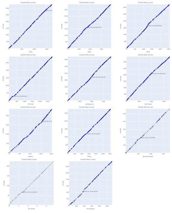 Double-mass curves were presented as a tool for evaluating the consistency of hydrological data—e.g., streamflow, rainfall, sediment series, etc.—from a single station by comparing it with a pattern composed of several nearby stations [30]. The principle of the double-mass curve is based on the fact that the cumulative graph of one variable against the accumulation of another variable over the same period is represented as a straight line as long as the two quantities are proportional, with the slope of this line being the constant of proportionality between them.
