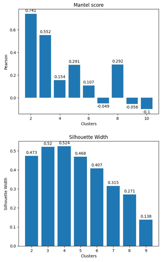 In addition, RainFA implements Mantel’s correlation coefficient test, which examines two distance matrices from the same samples. In this case, the initial distance matrix and the distribution into clusters matrix are compared, and, as a result, a correlation matrix is determined using the Pearson r coefficient for calculations [38]. The higher the correlation between the two matrices, the better the Mantel correlation.