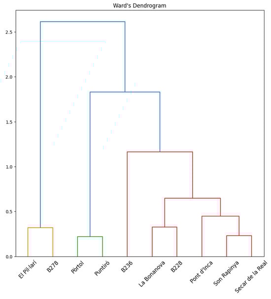 The minimum variance hierarchical clustering algorithm, or Ward’s dendrogram [39], is recommended for the identification of homogeneous regions in a clustering process such as that applied by the RainFA package for the evaluation of rainfall data in a specific geographical context [11]. Ward’s dendrogram algorithm uses the W function to minimize the sum of the squares of the deviations of the object vectors from the centroid of their respective clusters [42]: