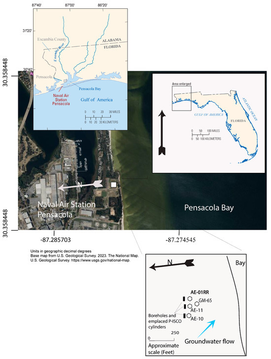 NAS Pensacola, FL is an active U.S. Navy (hereafter referred to as “Navy”) installation in coastal Escambia County, Florida (Figure 1). Operations started in 1825 as the Pensacola Navy Yard, and in 1914, NAS Pensacola became the first permanent naval air station in the United States. In 1989, NAS Pensacola was placed on the U.S. Environmental Protection Agency’s (EPA’s) National Priorities List of contaminated sites. One of these sites is a former wastewater treatment plant (WWTP), called solid waste management unit (SWMU) 1, Operable Unit 10 (OU10), located adjacent to Pensacola Bay (Figure 1). Industrial and sewage waste were treated together from 1941 to 1971. After 1971, industrial and domestic wastewater were processed separately. The WWTP was closed and demolished in 2019. On-site, unlined drying beds were used to dewater contaminated sludge and resulted in the migration of chlorinated ethenes into the shallow, sandy aquifer. Active disposal terminated in 1984 [9].