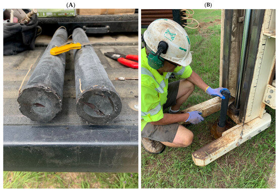 Picture of Sustained Oxidation and Controlled Oxidant Release Encapsulants (SOCORE), potassium permanganate cylinder (A) and emplacement in borehole (B), 7–9 July 2021, Naval Air Station (NAS), Pensacola, FL, USA.