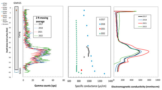 While the EM logs respond to the bulk electrical conductivities of the formation [αfm; Equation (2)] and the presence of the permanganate or breakdown products such as Cl− from the reaction [Equation (1)], the NGR logs are responding to decreases in gamma emitters of K-40, U-238, and Th-232. We conclude from the logging data and groundwater analyses that Mn(s) is coating the aquifer formation sediments in 2021 (29 days after the SOCORE emplacement) and, therefore, the coating serves to dampen the NGR signal, particularly within the silty-clay bed. The reaction reported in Equation (1) is rapid and likely happens within days [7]. Further, Mn oxides can form in mildly reducing subsurface conditions. Because this is a newly hypothesized observation, and other processes such as coating of non-radioactive K onto sediments also maybe a possibility in dampening the NGR signal, further research is warranted to investigate these hypothesized processes. In contrast, negligible changes in the NGR log in 2021 for well GM-65 suggest dampening does not occur within the silty-clay bed at this location because diffusion transport rates within the silty-clay bed are too slow to arrive in time at this location.
