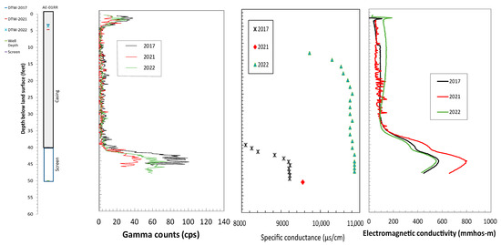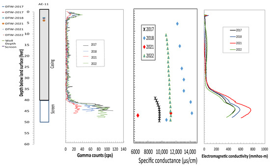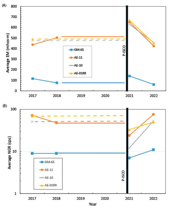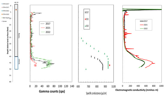 A suite of downhole geophysical logs was run in each of the three 50 ft monitoring wells in close proximity to the P-ISCO boreholes (Figure 1). In addition, a 65-ft (19.8 m) deep monitoring well (GM-65), screened in a lower sandy unit below 55-ft (15.2 m) depth, was also logged as a control well (although the screened interval is slightly deeper) (Table 1; Figure 1). The logs included natural gamma-ray (NGR) and electromagnetic (induction) conductivity (EM). The logs were collected on 8–9 August 2017 and 12 September 2018 prior to P-ISCO emplacement in early July 2021, and then again after P-ISCO implementation on 3–4 August 2021 and 19–21 September 2022. The three poly-vinyl chloride (pvc) monitoring wells are screened above and partly within the silty-clay bed (wells AE-10, AE-11, and AE-01RR) and the “control” well located nearby (23 ft distance; 7 m) that is screened below the silty-clay bed in a lower sandy uncontaminated aquifer (GM-65). Borehole EM- induction logging and NGR logging were done concurrently to identify changes in the bulk signal in the aquifer to determine if P-ISCO caused any changes from baseline conditions.