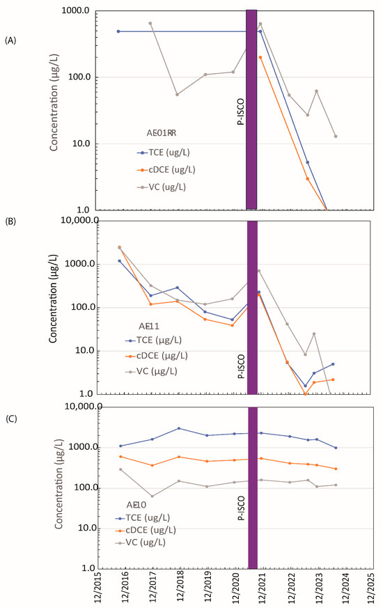 After P-ISCO addition, TCE, cDCE, and VC concentrations declined in groundwater in 2 (AE-11 and AE-01RR) of the 3 wells adjacent to the emplaced cylinders (Table 3; Figure 8). In contrast, well AE-10 has exhibited minor changes and in fact showed some increases in TCE immediately post P-ISCO. This may be because groundwater sampled from AE-10 is characterized by a lower pH than the other wells, caused by the former release of concentrated sulfuric acid to the aquifer [12]. Permanganate reactions in such low pH groundwater may have produced high concentrations of Mn2+ in groundwater at the expense of permanganate (Table 3). Further, the position of AE-10 is slightly upgradient of the other wells and is receiving untreated (with regard to permanganate) groundwater from upgradient areas (Figure 1 inset).