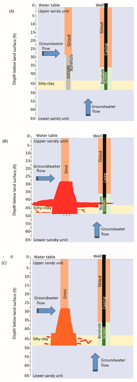 Conceptual illustration of passive in-situ chemical oxidation (P-ISCO) transport over time during installation (A), 1 month after P-ISCO (B), and 1 year after (C) for the P-ISCO experiment, Naval Air Station (NAS), Pensacola, FL, USA.