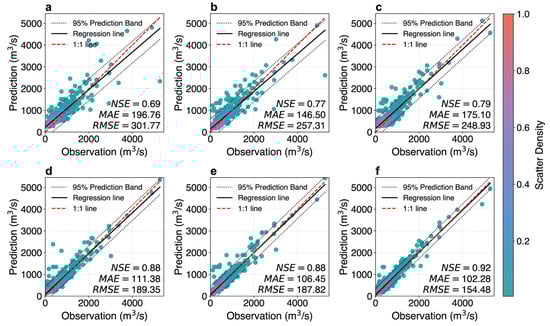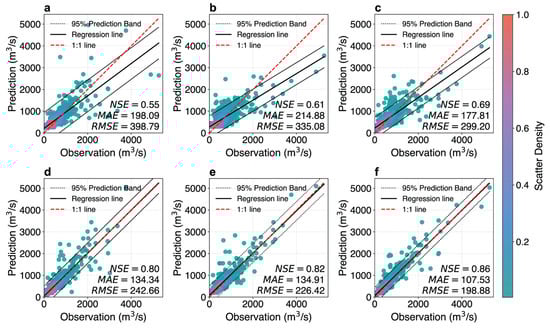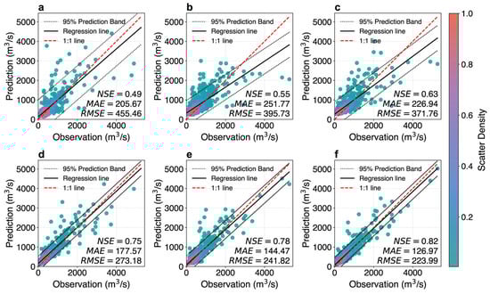 Scatter density plots of comparisons between predicted and observed discharge across different models at a 5-day forecast period: (a–f) represent MLP, GRU, BiLSTM, SA-BiLSTM, CNN-BiLSTM, and SA-CNN-BiLSTM, respectively.