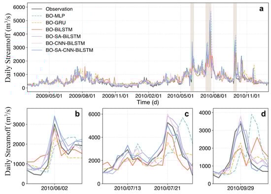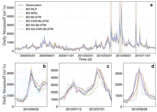 Comparison of streamflow predictions during the test period (a) and three flood events (b–d) between different models under a 5-day lead time. The shaded areas represent the three flood events identified by the POT method, corresponding to subplots (b), (c), and (d), respectively.