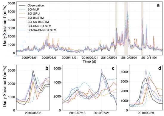 Comparison of streamflow predictions during the test period (a) and three flood events (b–d) between different models under a 1-day lead time. The shaded areas represent the three flood events identified by the POT method, corresponding to subplots (b), (c), and (d), respectively.